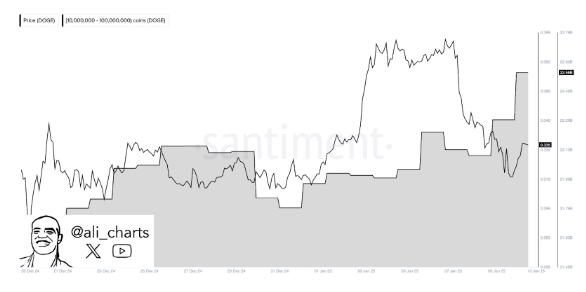 Speaking of investors positioning themselves for an upwards move for Dogecoin, on-chain data from Santiment shows that Dogecoin whale addresses have bought over 470 million DOGE tokens in the last 48 hours. As such, the total holdings of these whale addresses holding between 10 million and 100 million DOGE tokens now stand at 22.56 billion tokens, which is the highest in over 30 days.