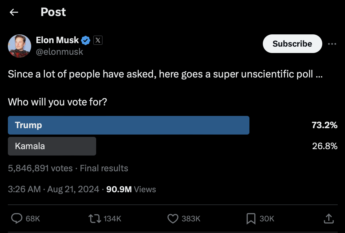 Source: https://coingape.com/donald-trump-wins-elon-musks-unscientific-poll-73-to-vote-for-trump/