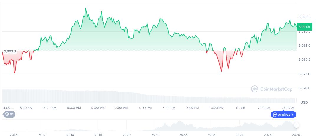 Ethereum (ETH) holds a market capitalization of $377.53 billion, with the current price at $3,127.98, according to CoinMarketCap. The 24-hour trading volume shows a significant change of 79.17%. Over the last 90 days, ETH prices have depreciated by 25.76%.