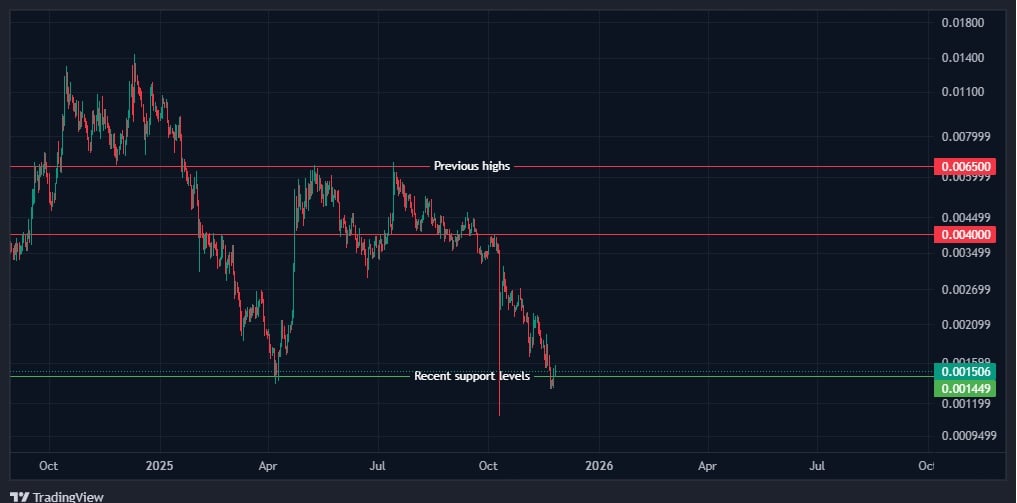 Turbo has rebounded from key support at $0.0015, gaining nearly 10% in the past 24 hours. While it hasn’t yet reached its 2023–2024 highs, the token has consistently held above this support, suggesting buyers are stepping in at lower prices.