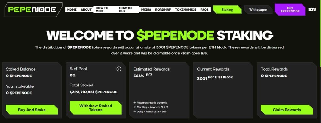 Adding to its appeal, Pepenode currently offers staking rewards exceeding 500% APY, displayed on the dashboard where users can also track how many tokens have been staked.