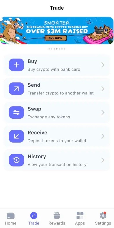 Fortunately, Best Wallet does not require you to complete the KYC verification; you can register with nothing but an email address and a password. Once you do so, you will be greeted with a clean interface that displays the list of supported cryptocurrencies on the front page. Navigate to the Trade tab, which is the second tab on the left at the bottom of the screen.