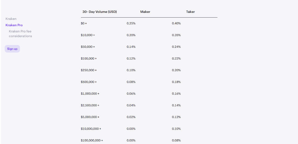 Maker and Taker fees on Kraken Pro (spot) are tiered. Maker fees range from 0% to 0.25% depending on Volume. Taker fees also range from 0.05% for volumes over $500 million to 0.4% for less than $10,000.