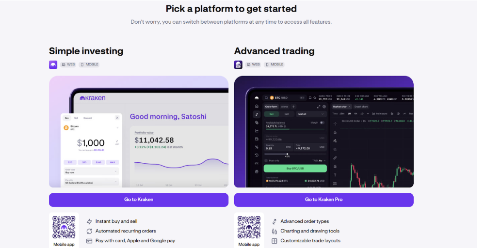 The regular Kraken Platform allows users to purchase crypto instantly using traditional banking methods, while Kraken Pro is the advanced trading platform. Here are the primary features of Kraken