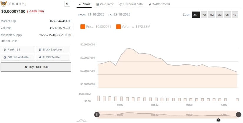 According to BraveNewCoin data, the coin trades at $0.00007100, down 3.82% over the past 24 hours, with a market capitalization of $686.5 million and trading volume of $171.8 million. Despite recent losses, the asset I continues to rank among the top meme tokens by market cap, reflecting steady community backing and speculative interest.