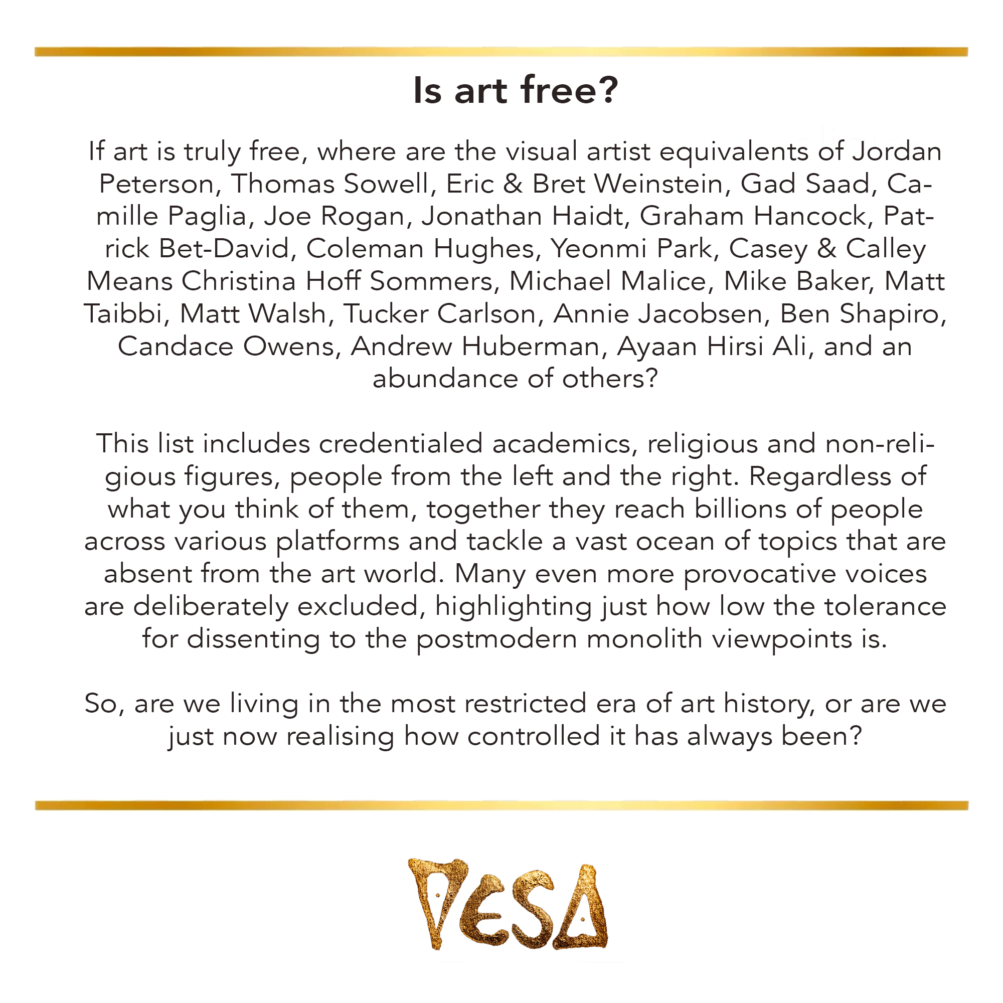 Postmodernism isn’t just an art issue—it’s everywhere. This single, pervasive philosophy has seeped into big tech, corporations, legislation, media, and nearly every major institution, often strangling genuine creativity, diversity of thought, and depth. For comparison, there are around 200 other philosophies, 4,300 religions, the male perspective, homemaker moms, the working class, the diminishing middle class, the scientific paradigm, and much more that are left out of gallery circles simply because they don’t fit the dominant narrative, which paradoxically claims to be the one that’s repressed. It’s really a luxury belief for the modern aristocracy—a tool for control—and the Marxist roots always emerge when pressure is applied.