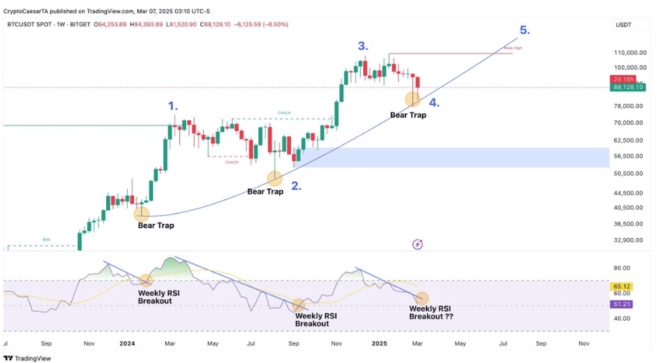 While many in the crypto market label this massive decline in the Bitcoin price as the beginning of the bear market, others believe that this price crash could be a mere bear trap. A market expert known as ’Crypto Caesar’ predicted that Bitcoin would be on the verge of its final bear trap before entering the last phase of this bull cycle.