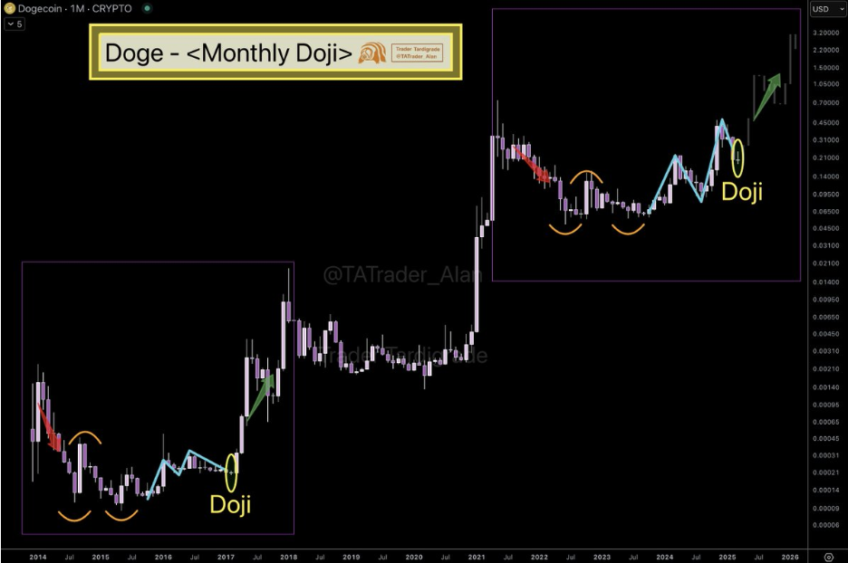 Crypto analyst Trader Tardigrade revealed that Dogecoin’s monthly candle has formed a doji, mirroring the same position in the previous cycle. He added that this doji might kick off a DOGE bull run, similar to the massive spike in the 2017 bull run. Interestingly, in an earlier analysis, the analyst stated that the foremost meme coin could move to the upside this weekend.