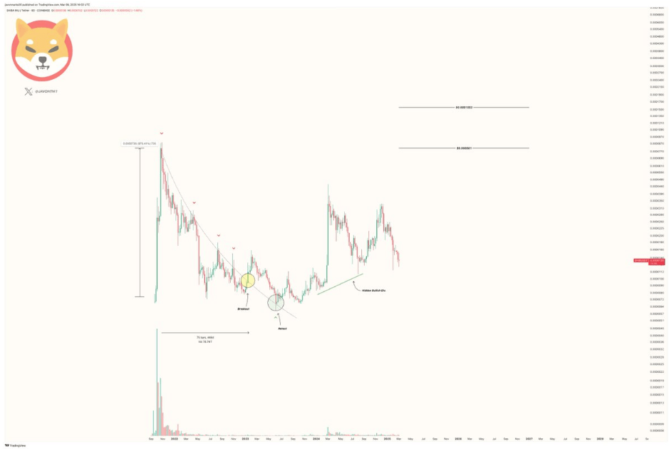 Meanwhile, in an X post, crypto analyst Javon Marks indicated that the Shiba Inu price is eyeing a rally to $0.000081, representing a gain of over 480% from the meme coin’s current level. The analyst had earlier noted that SHIB continues to hold its breakout which took place between 2022 and early 2023. With the price breakout holding, the analyst asserted that the target continues to be at the $0.000081 point.