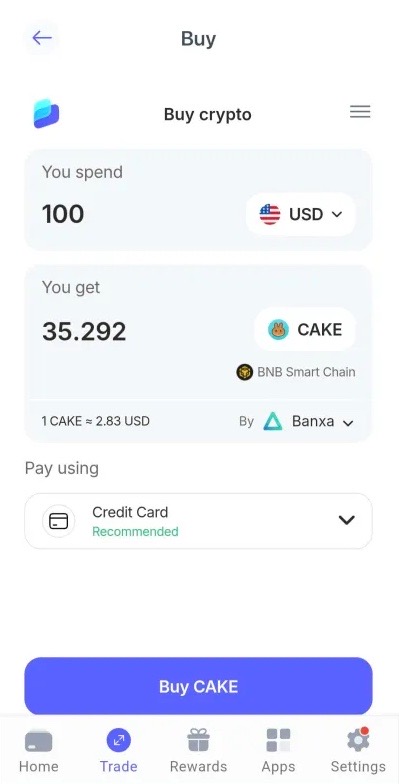For now, tap the Buy option, and you will see the list of all available cryptos. Look up PancakeSwap, either by scrolling or through the search feature, and tap on its name. You will be taken to the buying screen, where you can enter your preferred payment method and fiat currency, the amount of CAKE you wish to buy, or the amount of fiat you wish to spend.