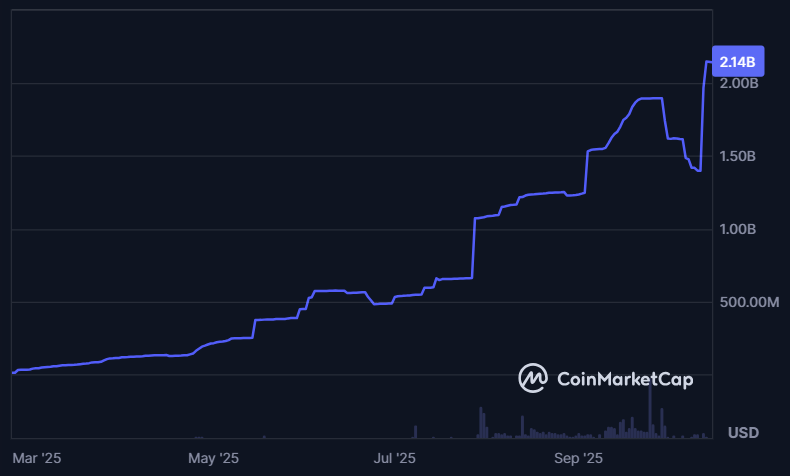 USDf market cap from March to October 2025. Source: CoinMarketCap