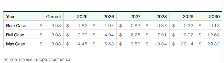 In the maximum price scenario, Bitwise expects XRP to close at $4.48 in 2025, reach $6.53 in 2026, and $9.60 in 2027.