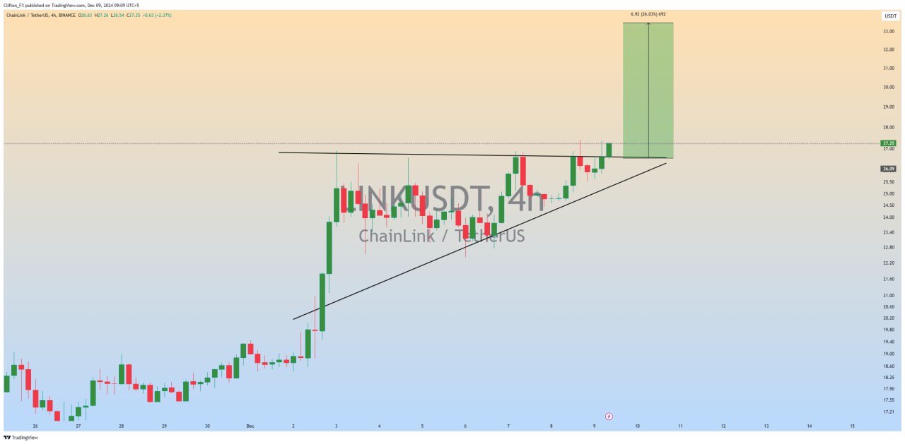 The tweet underscores a promising rally for LINK, suggesting a breakout from a classic ascending triangle pattern. The analyst shows the price steadily climbing, supported by an upward trendline. The resistance level appears to have been breached, signaling potential upside momentum.