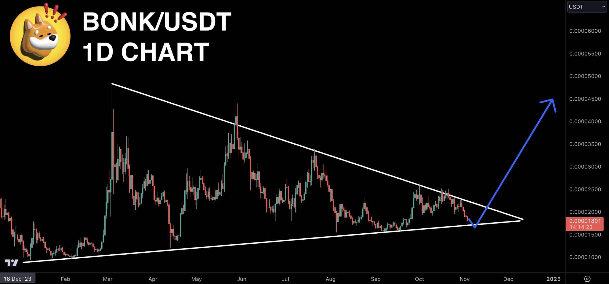 According to crypto analyst @cryptojack, the BONK/USDT pair flashed a symmetrical triangle pattern on the charts. Such a pattern is formed when a trend continues in a new direction, which could mean a potential bullish breakout when trading volume kicks in. However, this pattern has been forming for some months now. As it approaches an obvious breakout point, there could be higher levels of volatility soon.