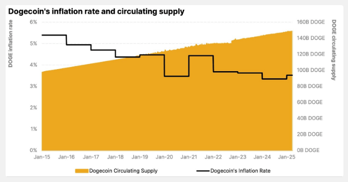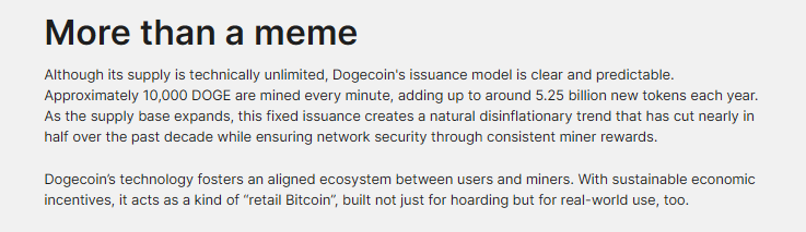 In contrast to Bitcoin’s fixed supply, there is no ceiling on the total amount of Dogecoin in existence. 10,000 DOGE is added to the network every minute, producing roughly 5.25 billion new tokens annually. 21Shares contends this linear mining system has resulted in decreasing inflation rates over time while securing the network.