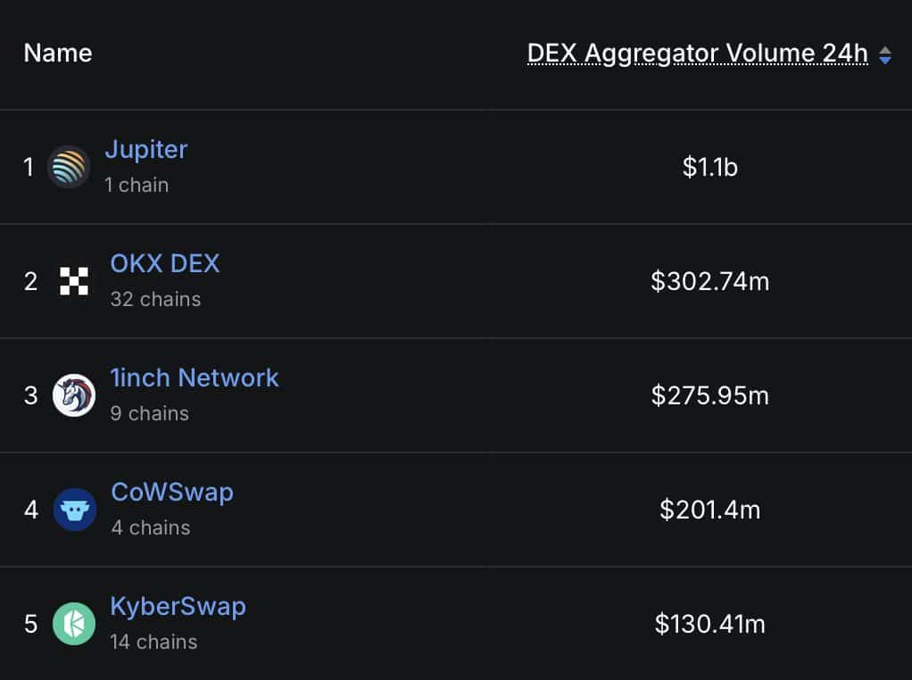 - Solana-based Jupiter Exchange records the highest 24-hour volume among all aggregators across chains.