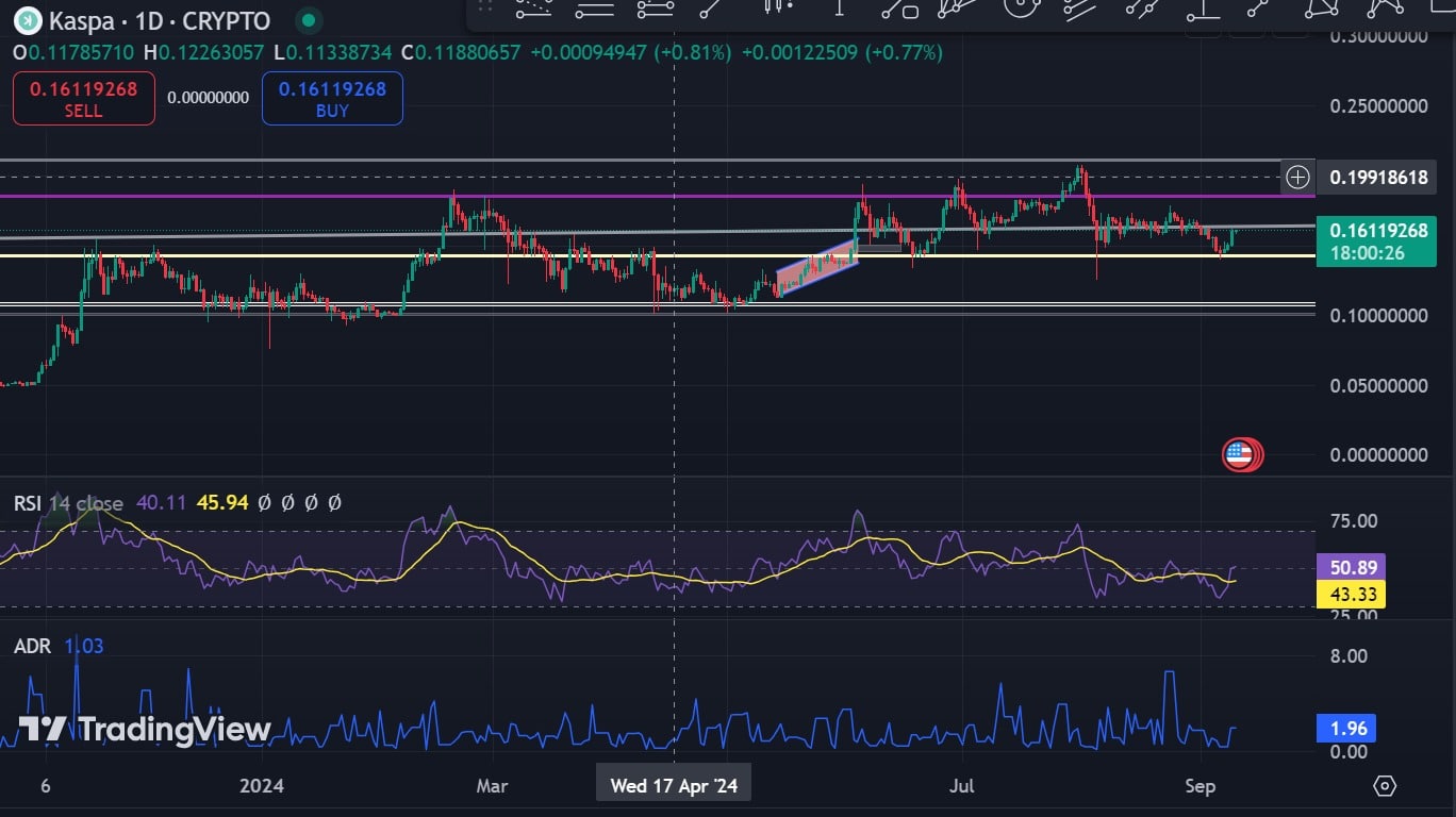 Prior to this uptick, KAS has been in a strong downtrend declining by 4.14% over the past month. Despite the upturn, Kaspa remains 20% below its ATH of $0.2 recorded on 1st August, 2024.