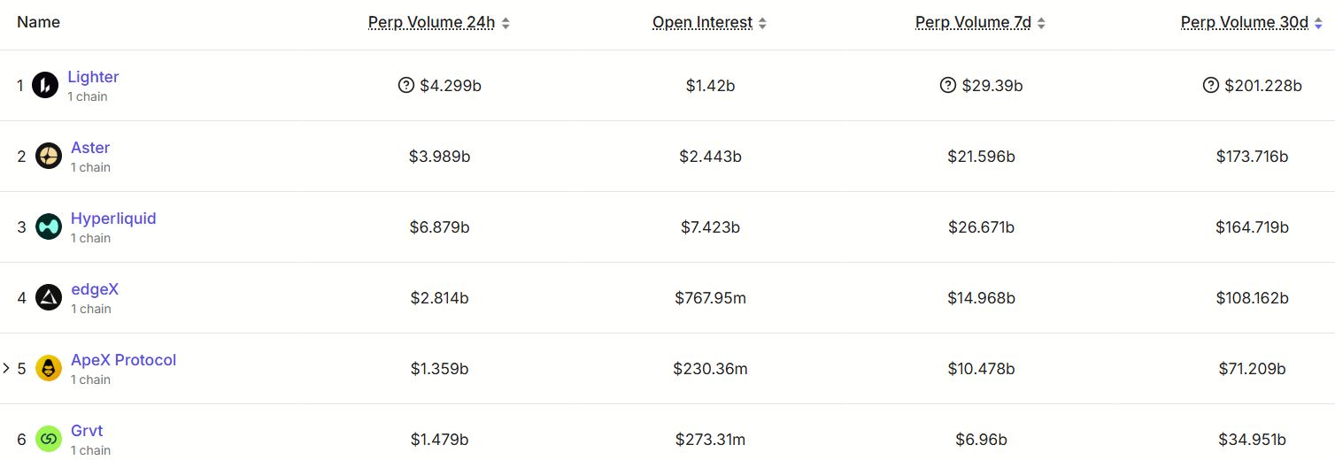 Over the same period, Aster recorded about $173 billion in trading volume, while Hyperliquid saw roughly $165 billion. On a 7-day basis, Lighter also led with $29 billion, ahead of Hyperliquid and Aster.