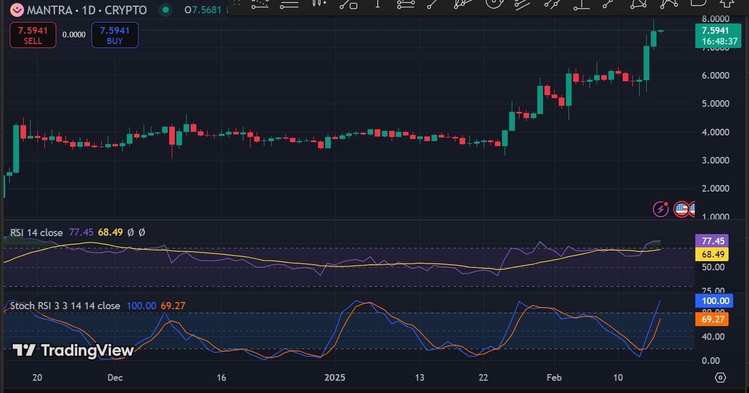 Over the past day, Mantra [OM] experienced a strong price upswing. In this period, the altcoin surged by 14.49% to hit a new all-time high of $7.96.