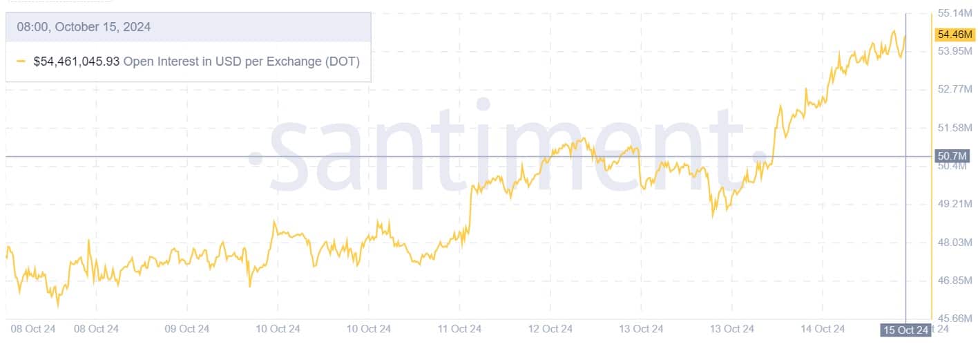 For example, Polkadot’s Open Interest in USD per Exchange has experienced a sustained increase over the past week. The altcoin’s Open Interest has increased from $46 million to $54.46 million at press time.
