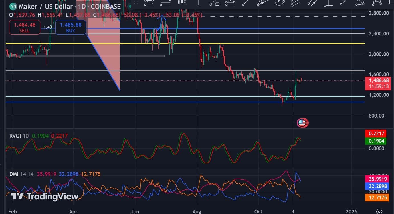 In fact, at the time of writing, Maker was trading at $1490. This marked a 1.90% increase on daily charts. Equally, the altcoin has gained on weekly charts by 30.8% and 11.38% on monthly charts.