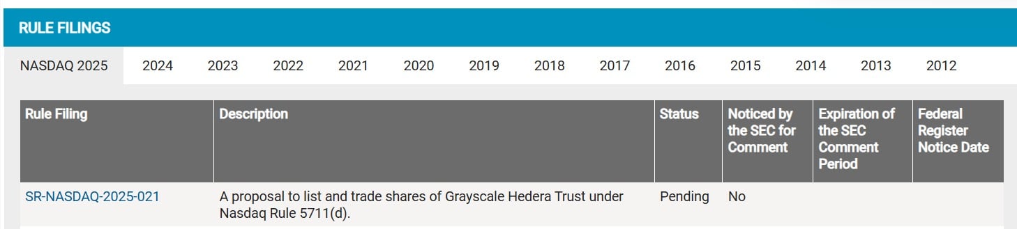 - Nasdaq files 19b-4 form with SEC to list Grayscale’s Hedera ETFs.