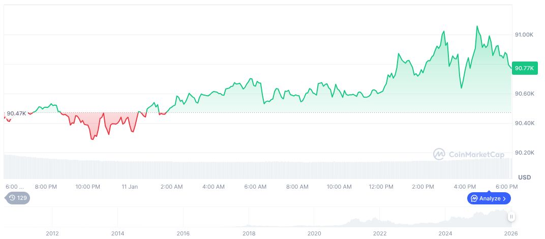 Bitcoin (BTC) remains steady at $90,709.39 despite macroeconomic concerns. Over the last 90 days, BTC has seen a decline of 21.29%, while the 24-hour trading volume surged by 40.80%. These figures highlight ongoing market volatility. Data: CoinMarketCap.
