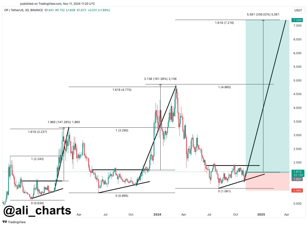 Now, analysts observe a potential third breakout point around $1.85. If Optimism follows its historical trend, the price could climb toward $7.20, which corresponds to the 1.618 Fibonacci retracement level.