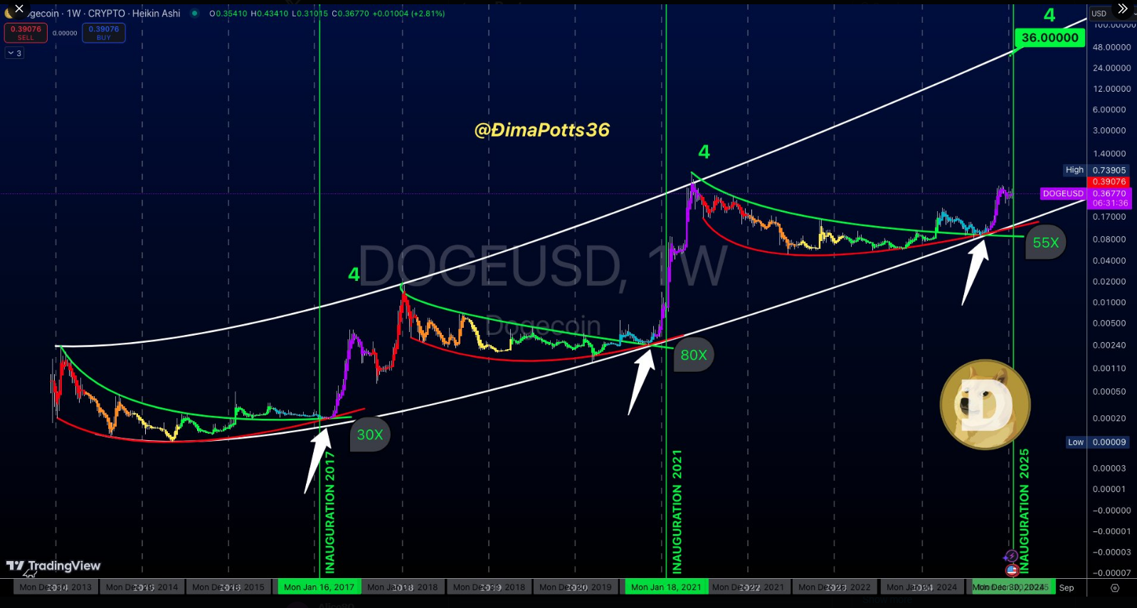 Potts predicts comparable growth potential for the 2025 cycle. Just before the inauguration, Dogecoin was selling at $0.38. He believes that a 55x surge, which is the average of the prior cycles, might push the price above $20.