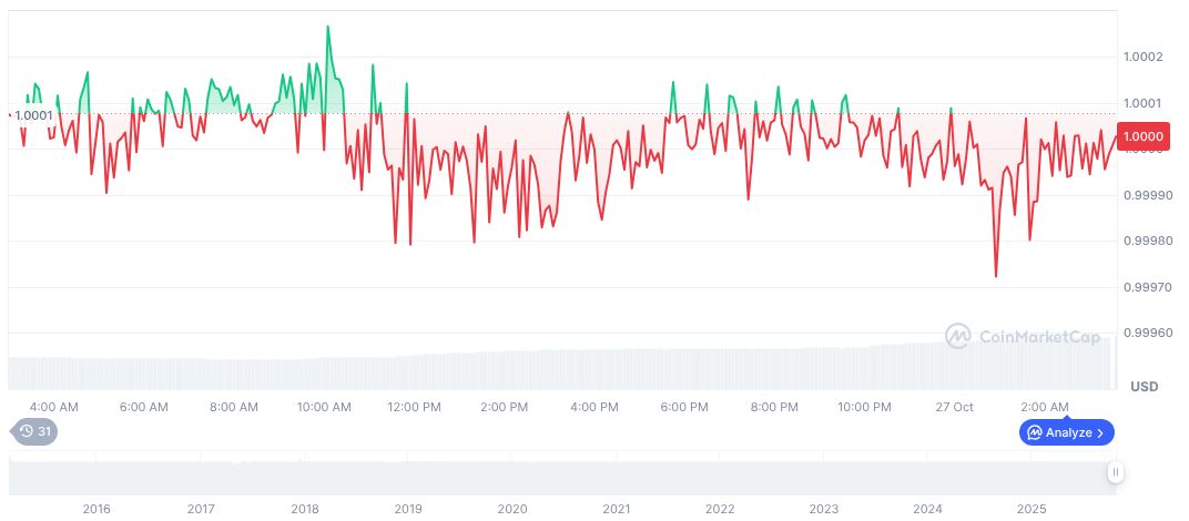 As of October 27, 2025, according to CoinMarketCap, USDT maintains a steady price of $1.00 with a market cap of $183.17 billion, representing a 4.69% market dominance. The stablecoin’s trading volume saw a significant increase over 24 hours, suggesting heightened market activity.