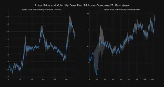 The chart below compares the price movement and volatility for Aptos over the past 24 hours (left) to its price movement over the past week (right).