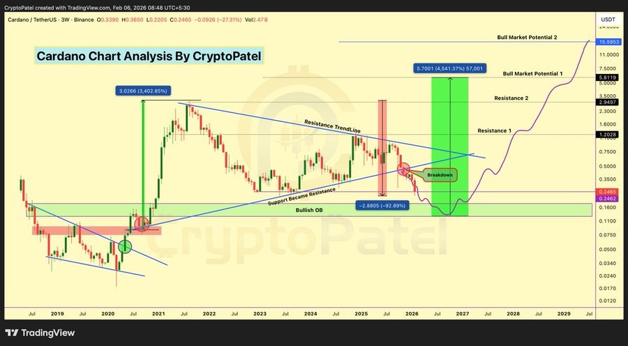 An analyst on X anticipates that Cardano’s price could surge by more than 4,500% if it holds key support levels. The bullish forecast came ahead of the launch of ADA futures products at the CME. The launch could pave the way for institutions to get exposure to Cardano, driving a notable recovery.