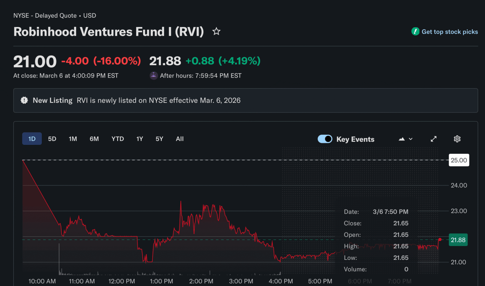 Venture Fund I of the investment firm Robinhood fell 16% in its public market debut on the New York Stock Exchange on Friday after its IPO failed to meet its IPO target. The fund, which now trades under the symbol “RVI,” provides access to prominent private companies.
