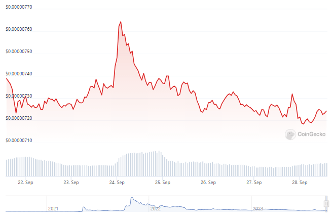 As of the latest data available on CoinGecko, SHIB is trading at approximately $0.000007258220, showing a minor 0.2% decline in the past 24 hours and a seven-day dip of 3.1%. These figures indicate the prevailing bearish sentiment surrounding SHIB.