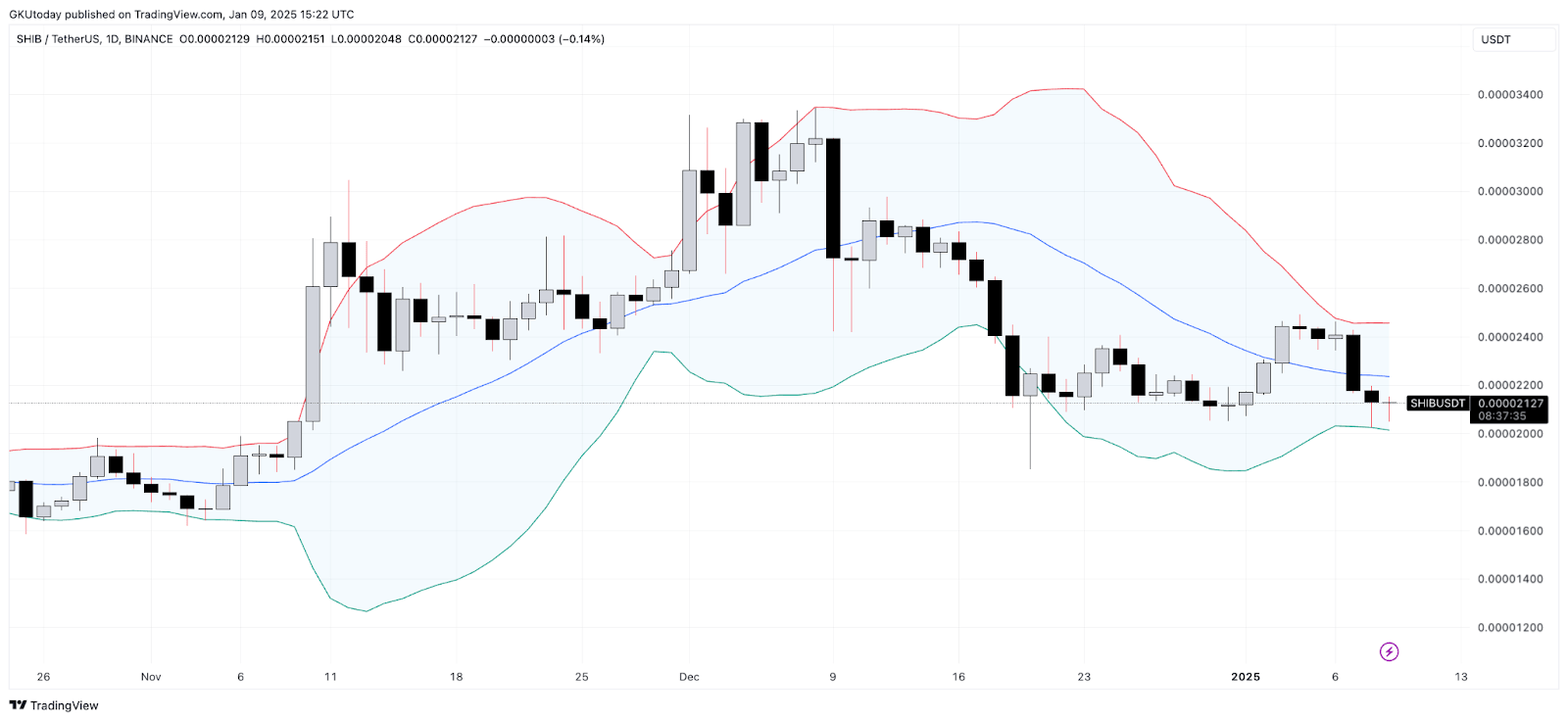 Shiba Inu ervaart momenteel een prijsdaling en wordt verhandeld op $0,000021. Volgens de Bollinger Bands bevindt SHIB zich dicht bij de ‘oversold’ — een belangrijk moment voor handelaren om op te letten.