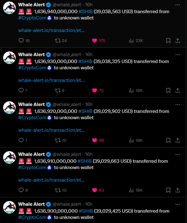 Op 3 januari 2024 brak SHIB uit een bullish dubbel-bodem koerspatroon en ging vervolgens een consolidatiefase in. De consolidatie duurde bijna drie dagen, waarin een mogelijke whale maar liefst 8,18 biljoen SHIB-munten, ter waarde van $195,1 miljoen, van Crypto.com exchanges naar een wallet verplaatste.
