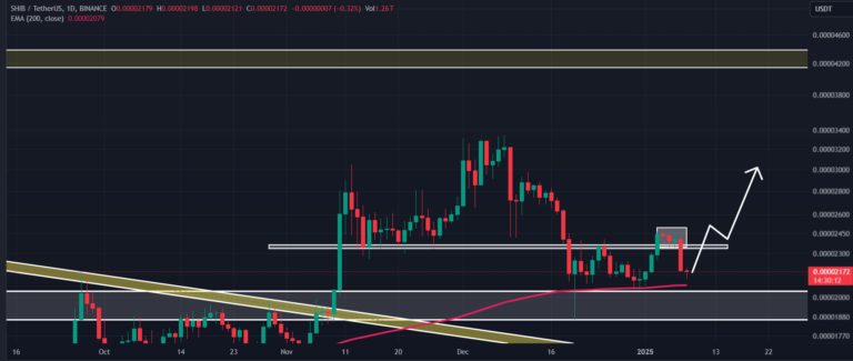 Volgens een technische analyse heeft de recente prijsdaling Shiba Inu (SHIB) naar een cruciaal horizontaal steunniveau gebracht, samen met het 200 Exponential Moving Average (EMA) op een dagelijkse tijdsperiode. Deze positionering maakt SHIB optimistisch voor een mogelijke opwaartse beweging.