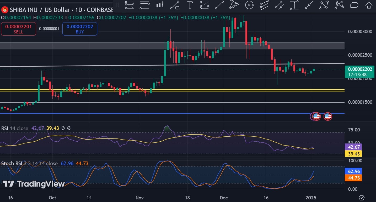 Shiba Inu [SHIB] has started 2025 on a high note. Since New Year’s Eve, the memecoin has surged from $0.000020 to a high of $0.000022. This marked a 10% increase over the past three days.