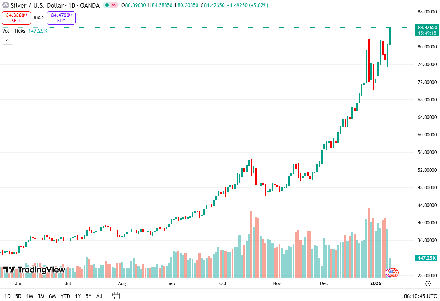 Silver hits fresh high above $84, gold breaks record after Trump flags possible action on Iran