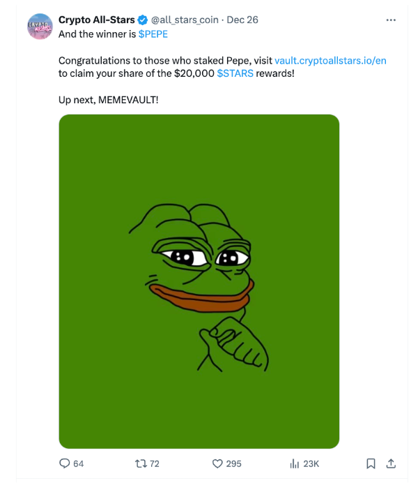 Crypto All-Stars, the unified staking ecosystem for meme coins, has announced that its native token, $STARS, will soon be listed on its first centralized exchanges (CEXs).