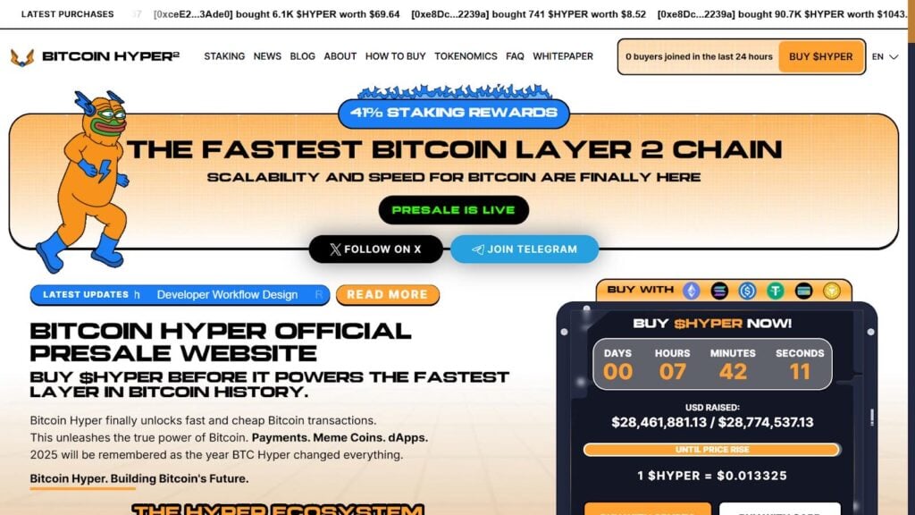 Its presale is open to multiple chains, including Ethereum, BNB, and USDC, and its smart contracts have been audited by Certik for added transparency. Currently, one $HYPER is priced at $0.013325 per token, and the project has already raised more than $28.4 million. The presale’s success shows that investors see real potential in a scalable Bitcoin network. Additionally, with dynamic staking rewards of over 40% APY and planned CEX and DEX listings, HYPER positions itself as one of the top 4 fresh crypto contenders.