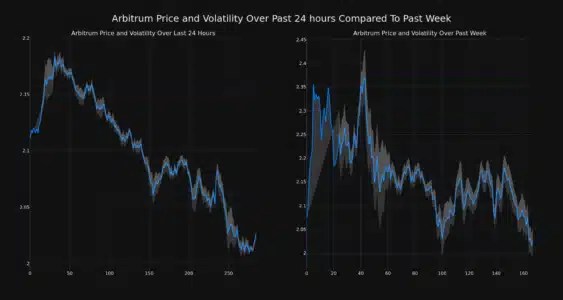 The chart below compares the price movement and volatility for Arbitrum (ARB) over the past 24 hours (left) to its price movement over the past week (right).