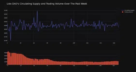 The chart below compares the price movement and volatility for Lido DAO over the past 24 hours (left) to its price movement over the past week (right).