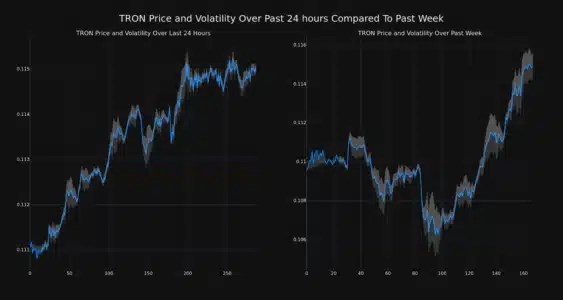 The chart below compares the price movement and volatility for TRON (TRX) over the past 24 hours (left) to its price movement over the past week (right).