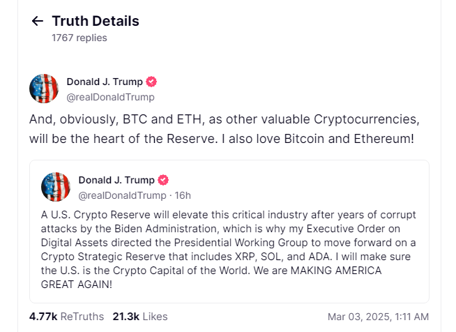 In a Truth Social post, Trump stated that the US should stockpile XRP (XRP), Solana (SOL), and Cardano (ADA). He also added Bitcoin (BTC) and Ethereum (ETH) to the list, saying these would be “at the heart of the reserve.”