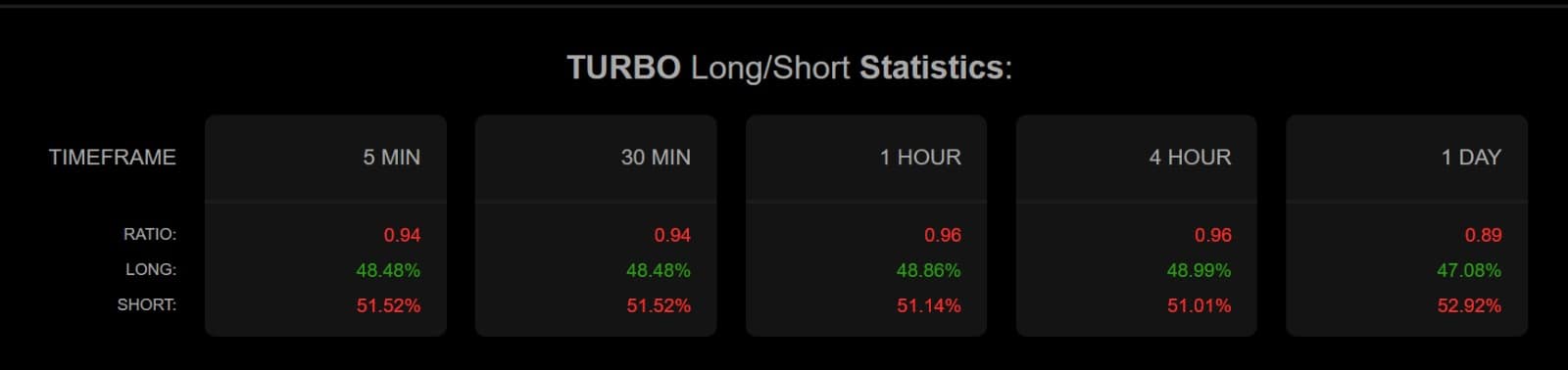 Additionally, the Futures market reflects bearish sentiment, with most traders shorting TURBO.
