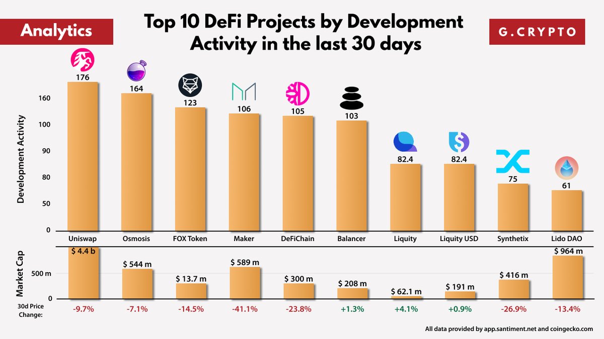 According to data from on-chain analytics platform Santiment, the decentralized finance (DeFi) protocol Uniswap [UNI] had the most development activity in the last month.