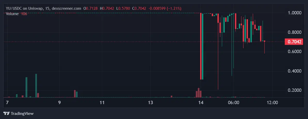 The YU price fell to $0.2074 before rising to $0.923 and is currently trading at $0.70. The YU/USDC pool on Ethereum on Uniswap has only 1,450 USDC in liquidity.