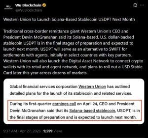 - Western Union CEO Devin McGranahan confirmed USDPT is in its “final stages” and set to launch next month on Solana.