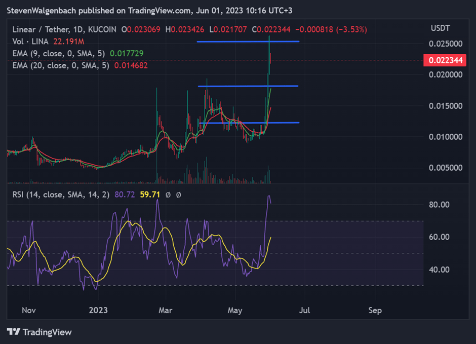 Thereafter, LINA’s price continued to climb and flip $0.018230 into support on 30 May 2023. The crypto attempted to do the same with the resistance level at $0.025239 on Tuesday and yesterday, but was unable to close the daily trading sessions above the mark. These failed attempts subsequently resulted in the recent drop in LINA’s price.